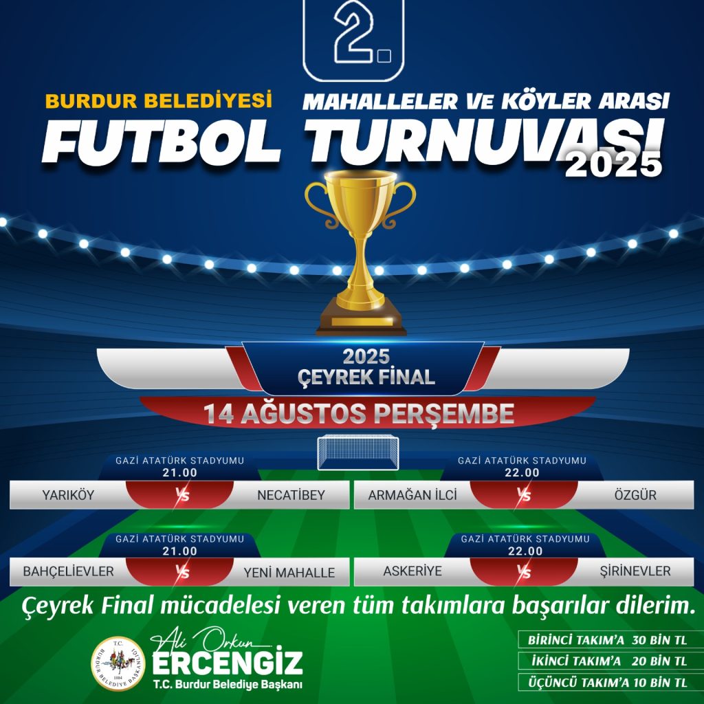 Burdur Belediyesi 2. Mahalleler ve Köyler Arası Futbol Turnuvası çeyrek final heyecanı 14 Ağustos’ta Gazi Atatürk Stadyumu’nda!