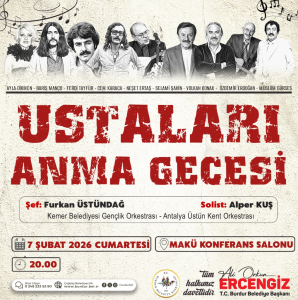 Türk müziğine damga vurmuş usta sanatçılarımızı anmak üzere düzenlenen Ustaları Anma Gecesine tüm halkımız davetlidir. 7 Şubat 2026 Cumartesi 20.00 MAKÜ Konferans Salonu Tüm halkımız
